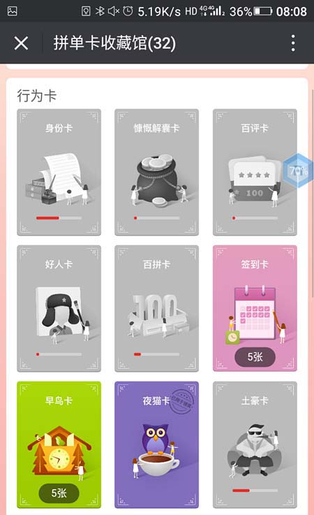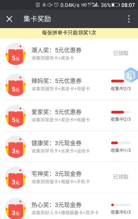 4、第一幅图可以看到我的各种卡收集的进程度,第二幅图可以看到种类卡收集满了以后可以兑换什么类型的拼单卡,有3元现金卷、5元现金卷,10元现金卷。点击单张卡片可以查看怎么才可以获得此张卡。
