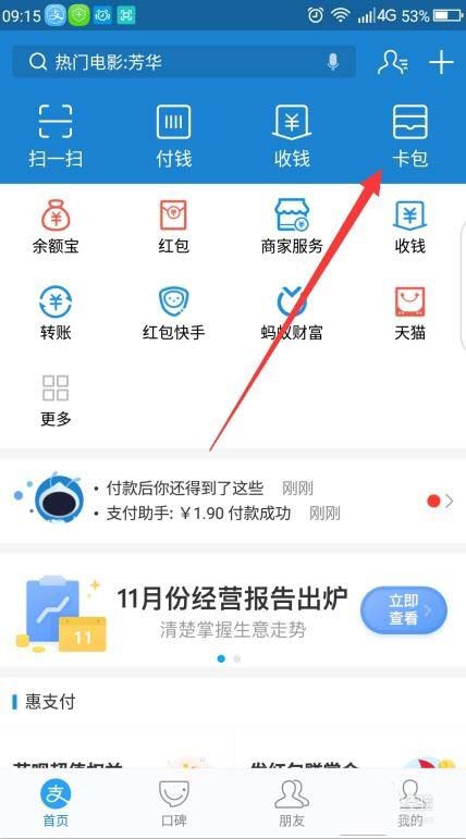 1、首先,在手机上找到支付宝软件打开,点击底部首页,再于右上方点击卡包。