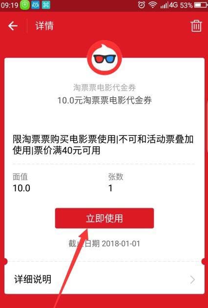 3、点击“淘票票电影代金券”,进入详情界面。看清楚说明,该票需满40元才可抵用。点击立即使用。