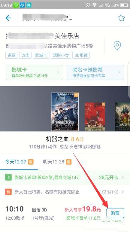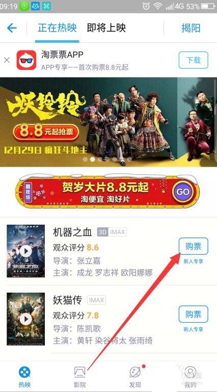 4、进入电影选择界面。这里面有新人专享优惠的电影票。找到想要看的电影,点击右侧的“购票”。