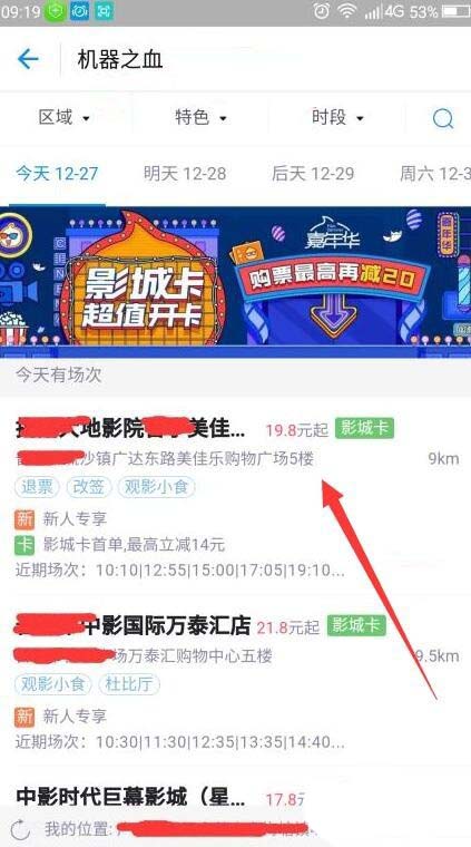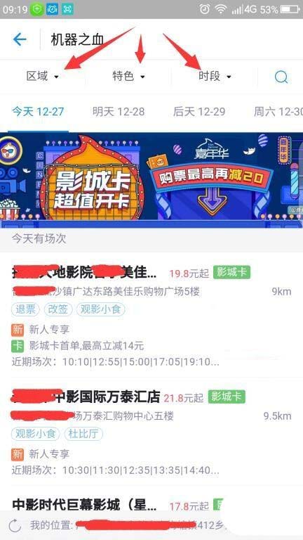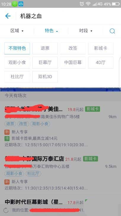 5、接下来进入区域、电影院等的选择。点击左上方的区域可以选择地点。点击特色,可以选择退票、改签等。点击时段可以选择电影的时间场次。