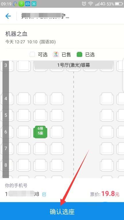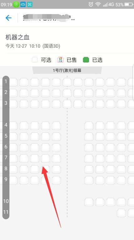 6、点击选定的电影院,进入购票,点击右下方的“购票”,弹出座位选择,对着座位图位置点击想要的椅子。