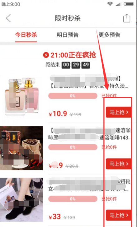 2、如下,我们点击的是“限时秒杀”活动页面,在此窗口中可以看到不同时间段的产品展现,可根据自己想要购买的所需点击相应产品右侧的“马上抢”红色按钮,进行抢购操作。