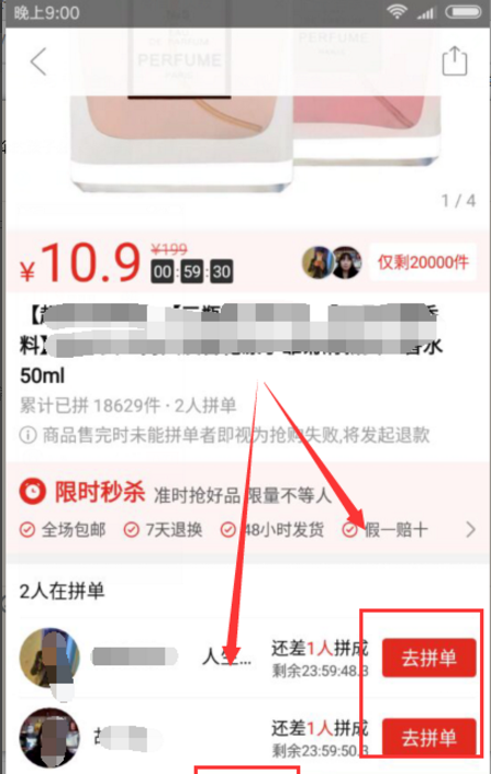 3、随意点击其中一个产品,打开页面中会看到有“去拼单”按钮,点击它可以直接与已经付款成功的网友进行拼单购物。