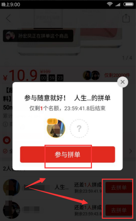 4、我们点击“去拼单”按钮,这时会弹出一个小窗口,再点击窗口中的“参与拼单”按钮,进行拼单流程内。