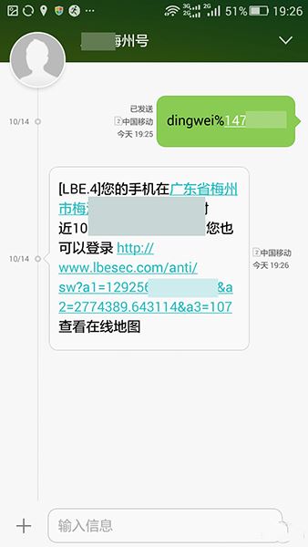 2、安装设置好之后,可以使用任意的手机发送短信“dingwei%(密码)”到已开启手机防盗功能的手机中,之后就会获得回馈的短信,在短信中就会得到手机的地理位置,如下图所示。