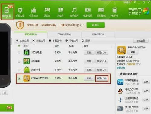 步骤二:下载安装完成之后在菜单栏中选择“我的手机”,就可以在“我的应用”中看到已经下载好的“找帮安全防盗卫士”,选择之后移到SD卡,如下图所示!