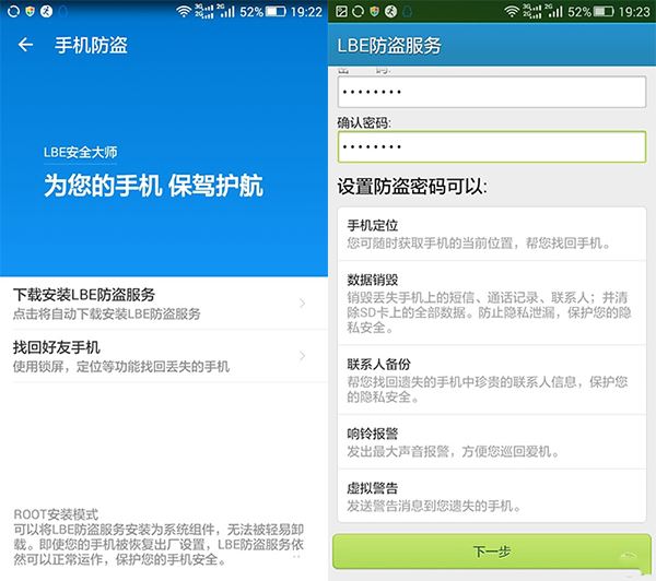 1、下载安装LBE安全大师——主界面——菜单——更多功能——手机防盗——下载安装LBE防盗服务——设置防盗密码——设置安全手机——发送防盗指令备份到安全手机。