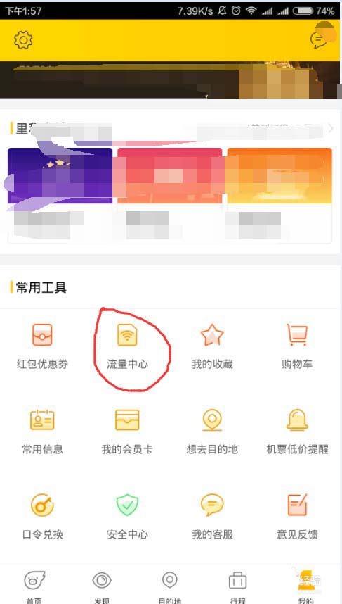 1、打开飞猪应用,在底部功能栏中切换到”我的“页面,页面如下图所示,点击红色标注的”流量中心图标