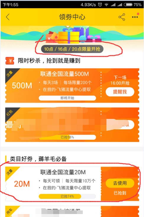 3、在弹出的领券中心页面,如下图所示,找到“联通全国流量20M的优惠券,点击领取,这个比较容易领取,数量很多,每天基本上都有