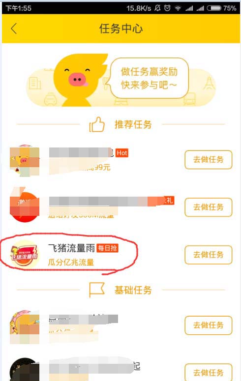 5、在弹出的任务页面中,如下图红色标注的位置所示,找到飞猪流量雨的任务,这个任务是每天可以做的,每天基本可以领取到30M-40M