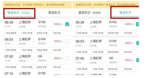 5、选择所乘车次,注意:选择首选车次后选择备选车次,