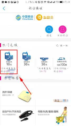 1)打开中国移动营业厅软件点击进入【积分商城】页面,进去后我们可以看到下面的积分兑换话费的功能栏,找到想要进行兑换的【话费】点击。(如下图)