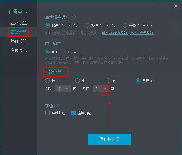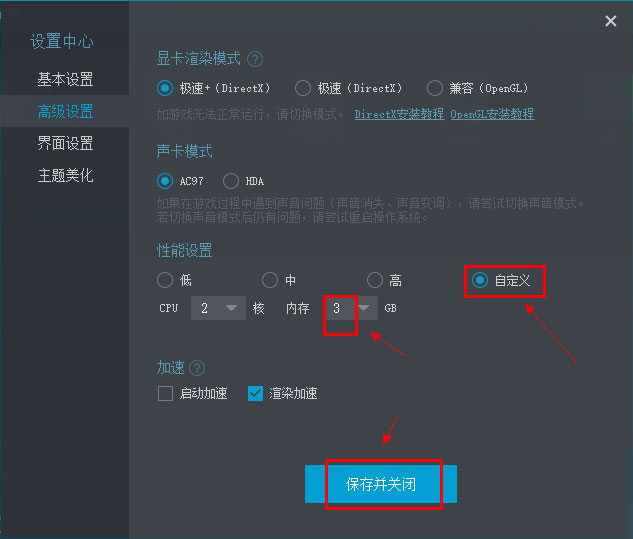 6、在性能模式自动义选项下将内存改为3G,然后点击保存并关闭按钮,如下图所示