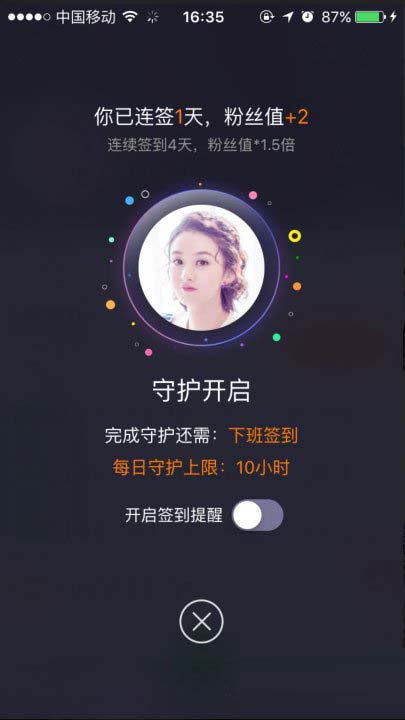 5、返回界面之后,你会在明星右侧看到需要下班签到的地方,但是上下班的签到时间不能瞬间完成,需要间隔10分钟才是可以的。你点击下班签到,系统会提示“守护最低时间是10分钟”;