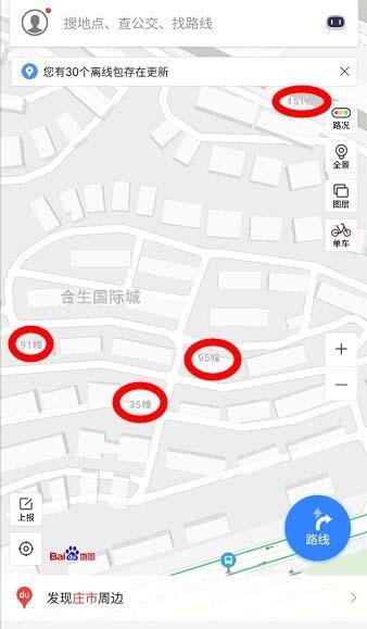 2、先比较一下离线导航数据,我们以同一个城市地点来对比:XXX小区,百度导航数据,小区幢号标识的很少,如下图所示