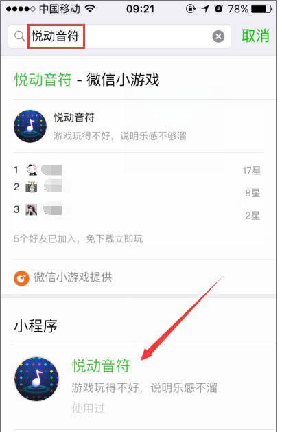 1、在微信“发现”-“小程序”手动输入“悦动音符”进入搜索,进入游戏就能直接开玩了!