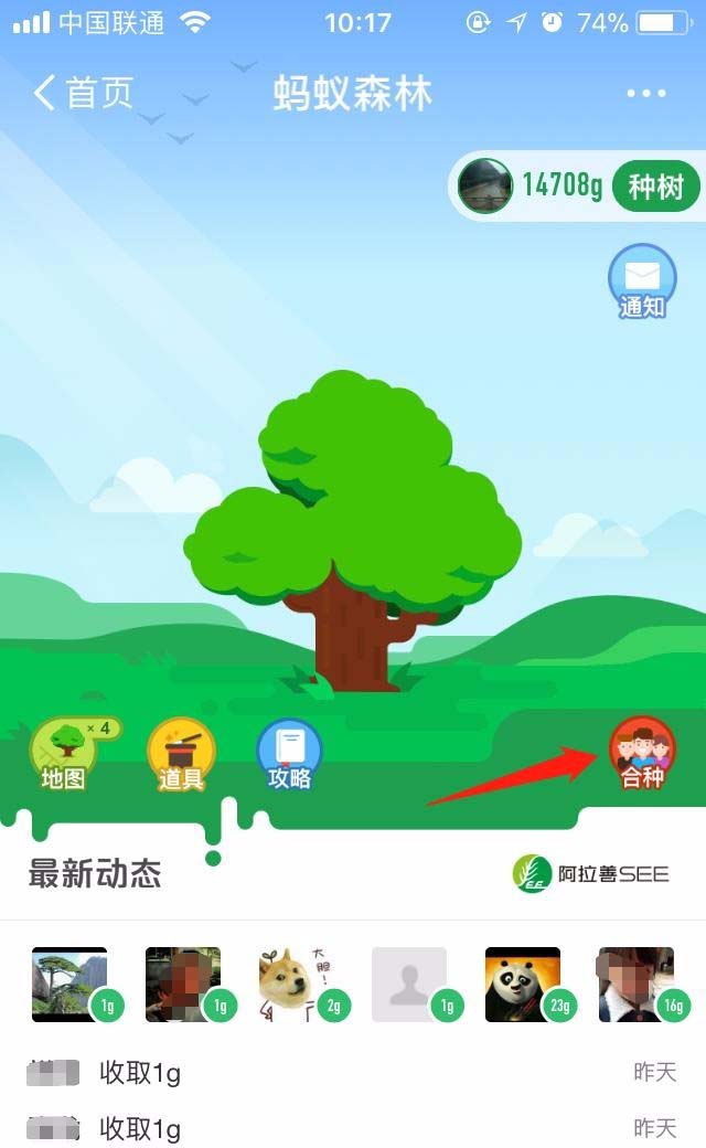 1、进入支付宝钱包里边的蚂蚁森林之后,我们就可以在中间右侧的位置看到“合种”的选项,点击进去看看怎么合种吧。
