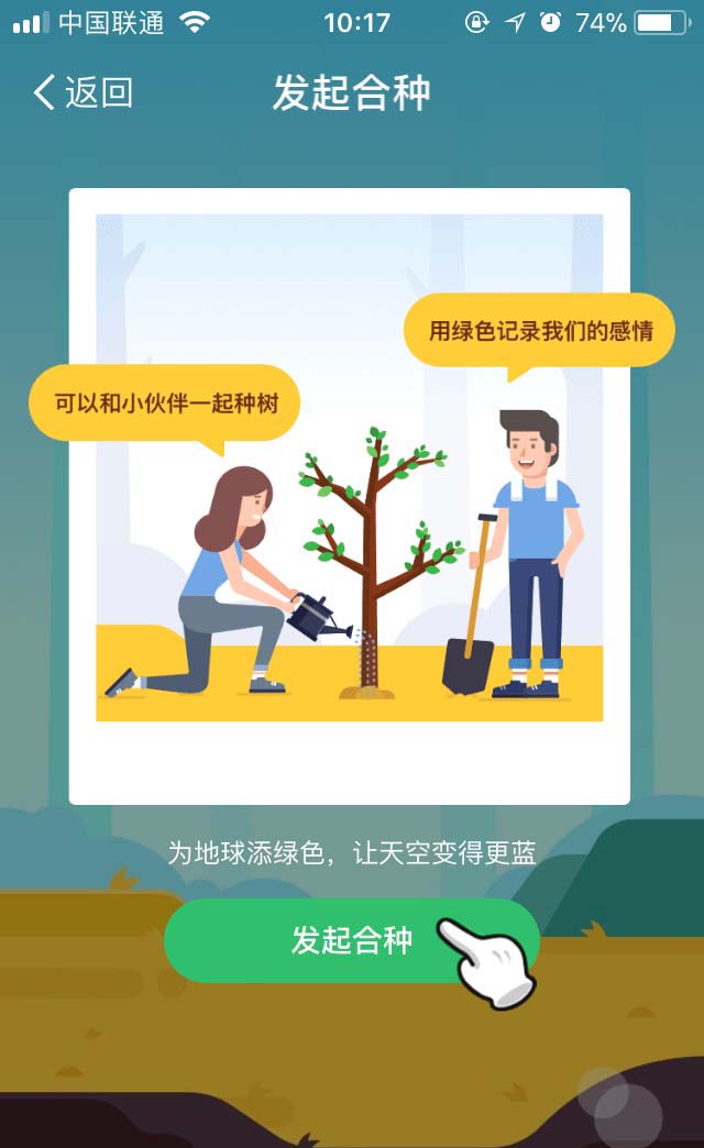 2、合伙种树其实没什么,主要是借此可以通过网络的方式来升华我们所经历的亲情、友情、爱情,点击“发起合种”选项。