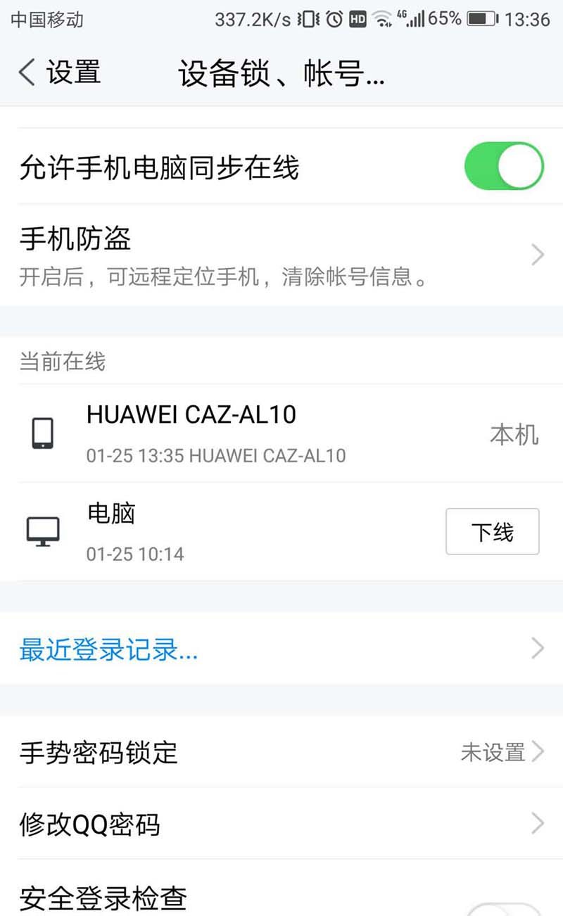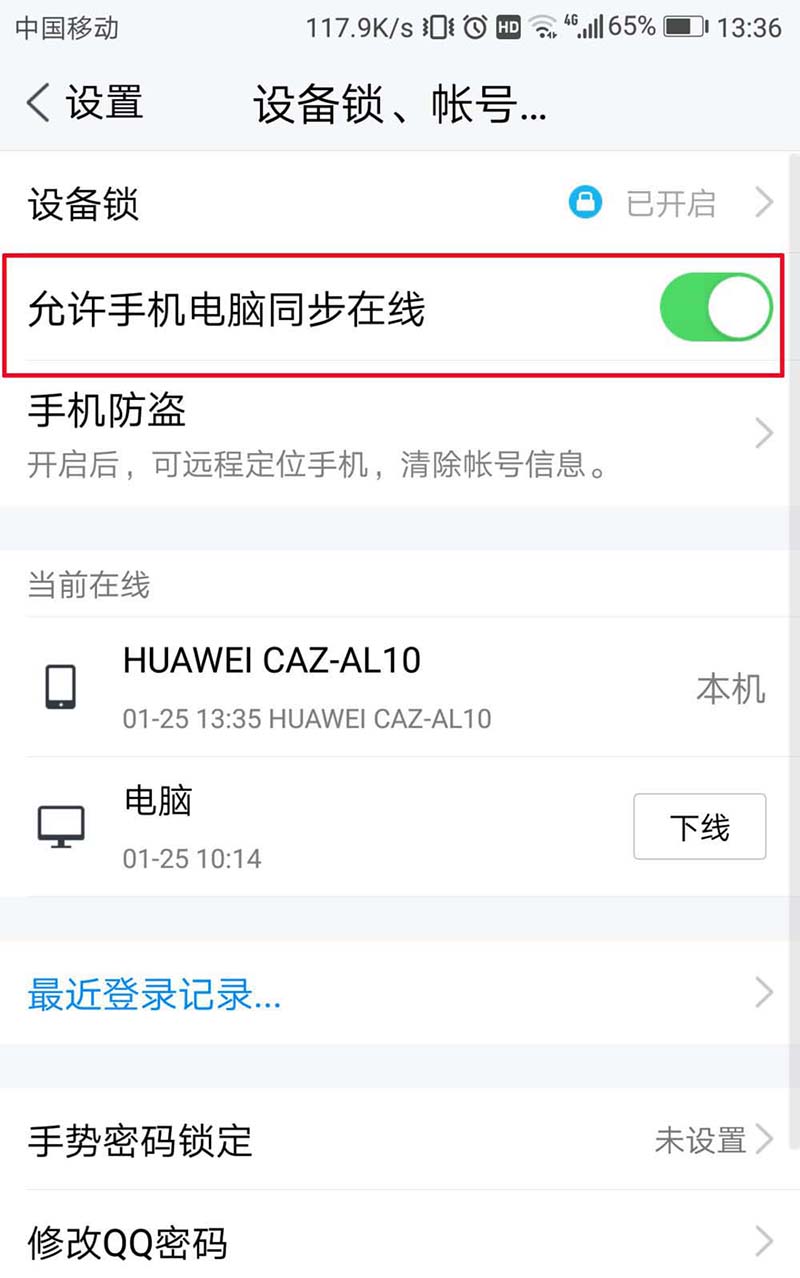 5、这里就有一个“允许手机和电脑同步在线”,也就是手机和电脑会受到同样的消息。大家点击旁边的关闭就可以了。