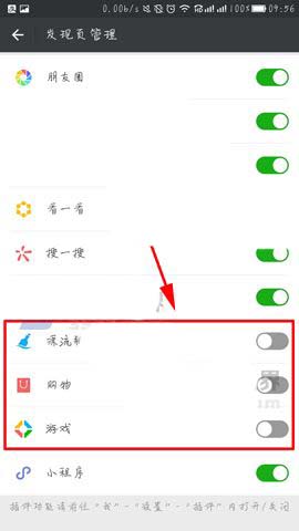 2)找到并点击【发现页管理】,这里以漂流瓶、购物、游戏为例。(如下图)