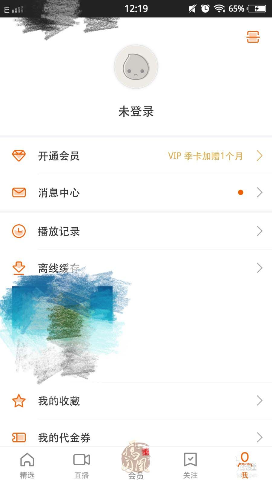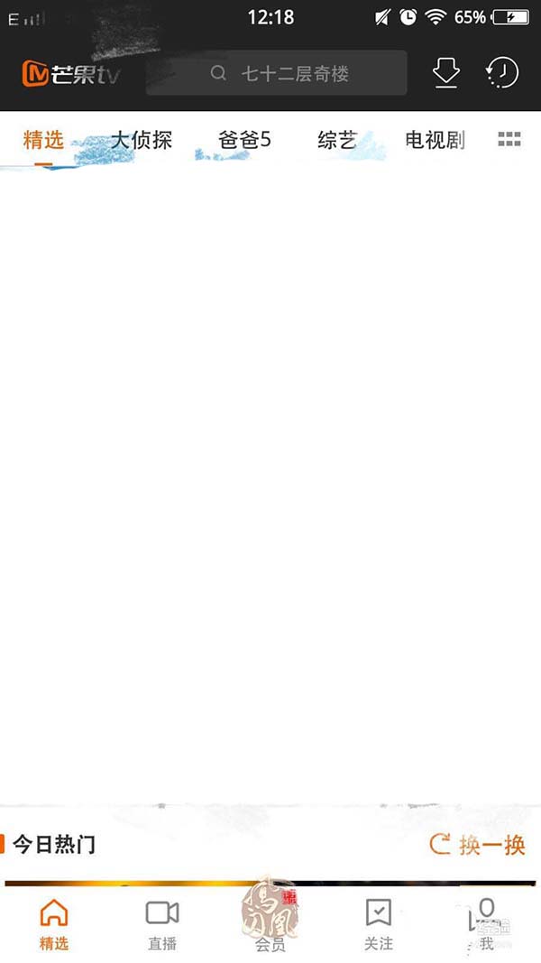 1、打开主页面如下图,在下方分别有5个图标精选、直播、会员、关注以及我;