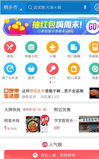 2.第二步:点击下方“口碑”,选择自己所在城市,每周五晚上8点以后和周六、周日都会出现上方“抽红包嗨周末GO”的连接,点击进去