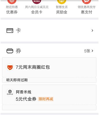 3.第三步:在支付首页中,点卡包可以找到所抽到的红包,红包有2-100不等,基本上以5元、7元比较居多,5元红包(口碑商家满20元即可使用),7元红包(口碑商家满30元即可使用)