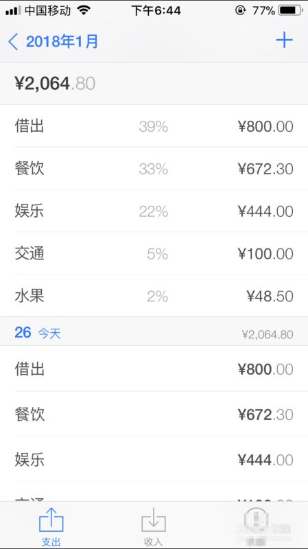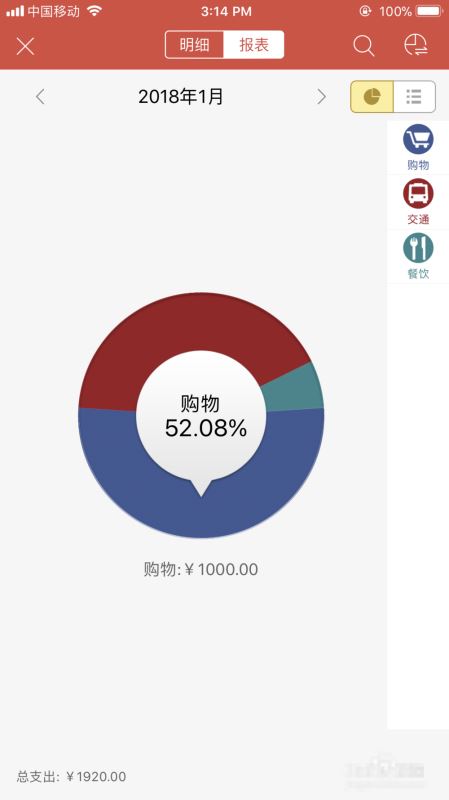 就图表来说也是我最喜欢的一种,一会儿要说到的挖财,是需要通过手指转动才能看到不同的支出比例,步骤多了一步,整体也不直观。网易有钱的支出数目、构成、各自比例很清晰。深红色表示最多,然后依次变淡,这个设计也挺符合国际流行理念,大家都看过类似报表图吧?