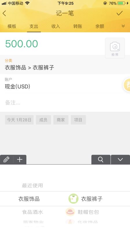 虽然刚刚把随手记的界面设计批了一通,不过记账功能的设计还是很大而全的。首页可以设置预算,预算余额用柱形表示,随着预算总额的接近,柱形的高度会降低。点击“记一笔”右侧的饼图,可以进入报表页面,和挖财类似,也可以通过转动饼图来查看每类收支所占百分比,再点击数额,就能看到详细流水。记账初期会被各种标签绕晕,熟练之后,我对于这种详细的类目设置,接受度高多了。不过进入到相关功能后,首页下方6个功能类目切换栏就会消失,想要切换到其他功能,还要返回首页,这一点不太方便。