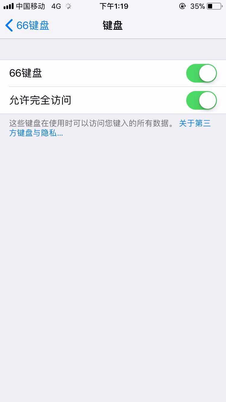 下载好了之后,我们要允许66这个程序去访问键盘才可以,最好选择完全访问(这样才可以在每个APP里用这个键盘来进行发言,比如我们的王者荣耀)