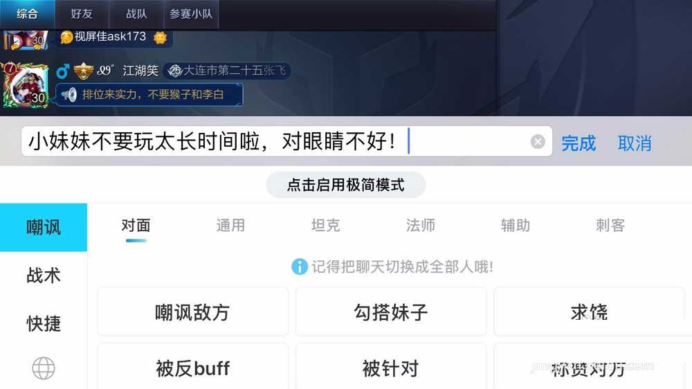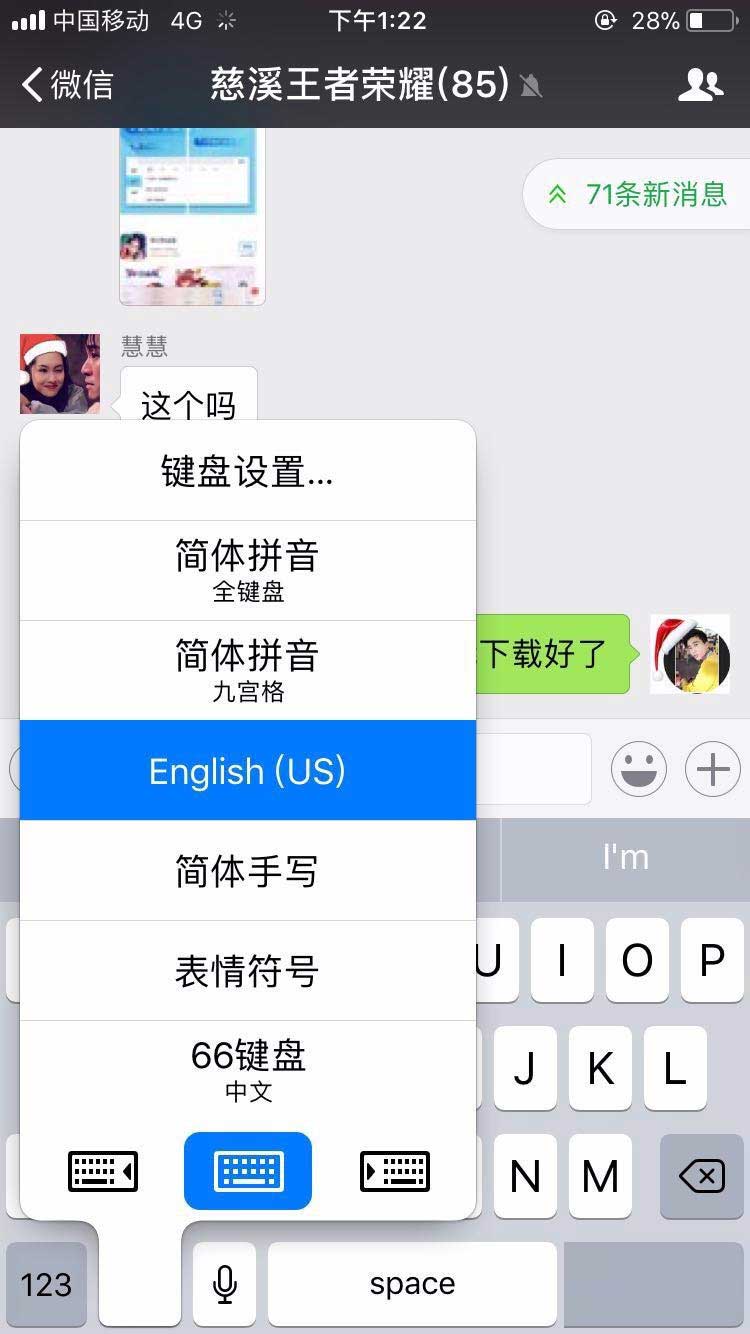 刚才我们试的是微信里,因为我们设置了完全访问,所以其他程序都是可以的,我们可以打开王者荣耀里试一下,聊天界面,我们也可以切换键盘尝试发言。