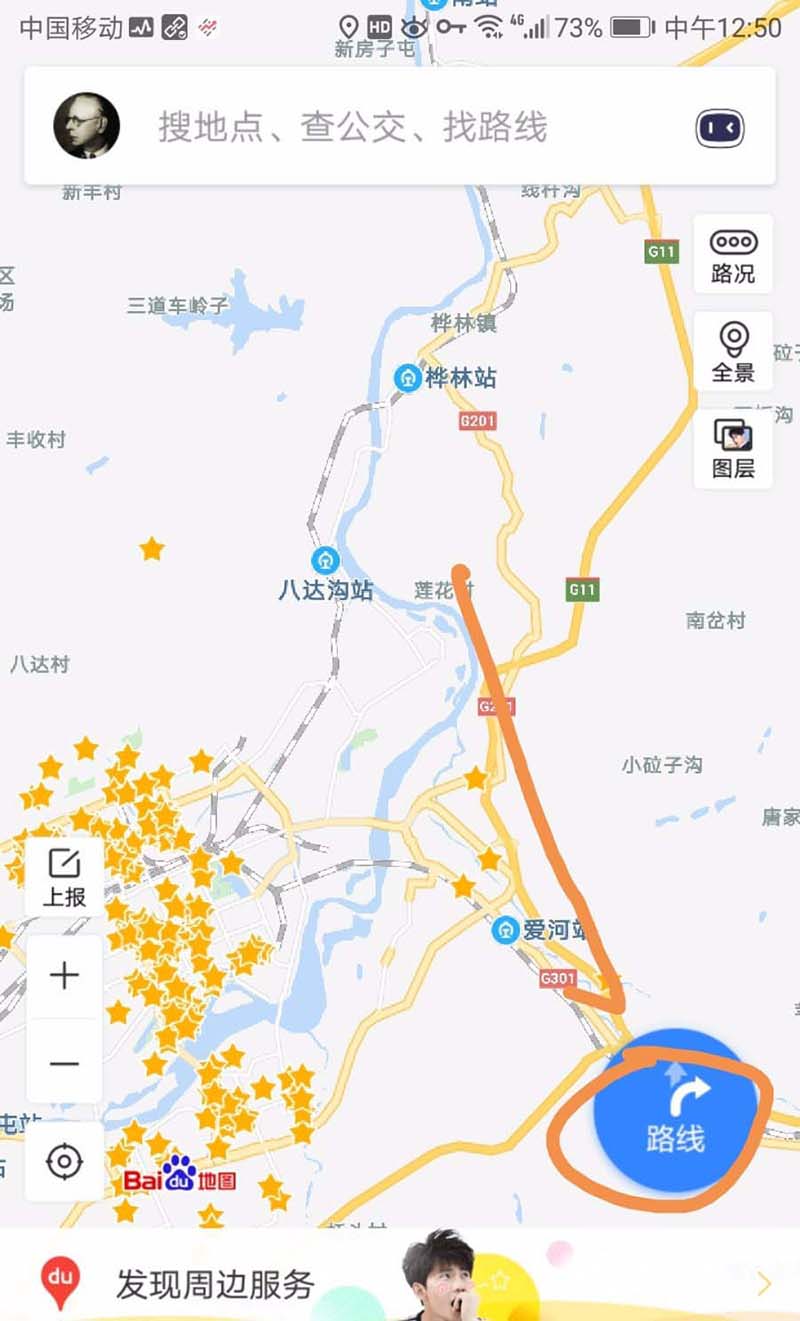 2、进入百度地图主界面之后点按箭头指向的线路字样标志。