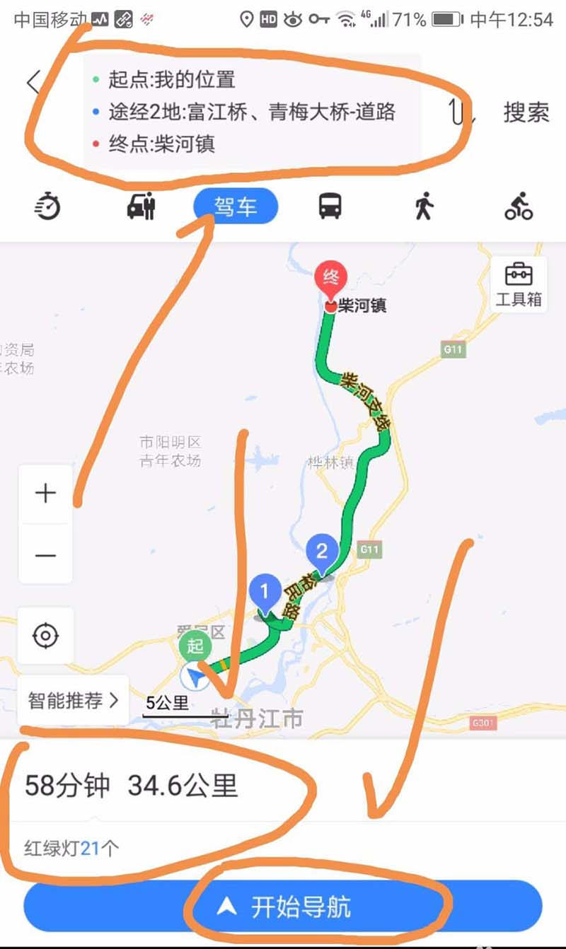 9、此时可以看到界面中已经显示出了起点(我的位置),第一和第二途经点以及终点的线路图,只需按导航就可以完成该段路线了。