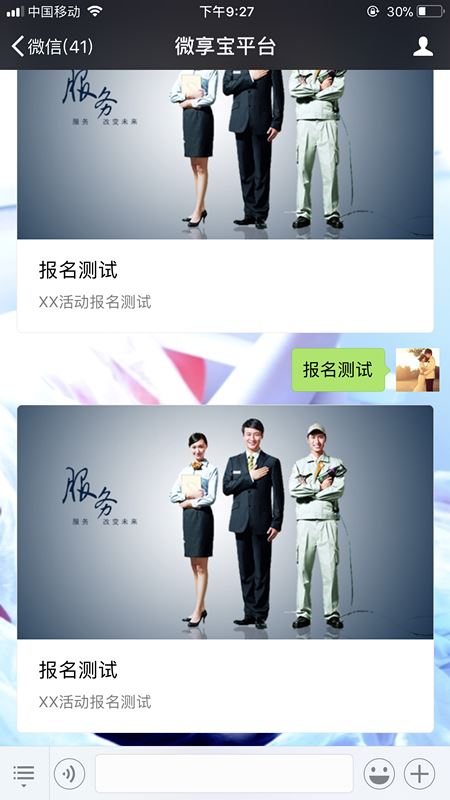 6.回复你刚才设置的活动关键词,系统就会弹出来你做好的内容来,点进去就可以参与了。粉丝在手机上填写的内容在制作的后台都是有记录的,可以利用微信模板消息,粉丝预约了以后就会有提示的