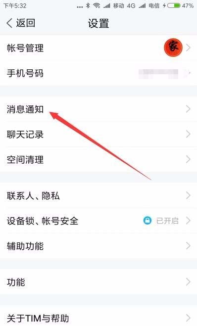 4、在打开的TIM设置页面中,点击“消息通知”菜单项。