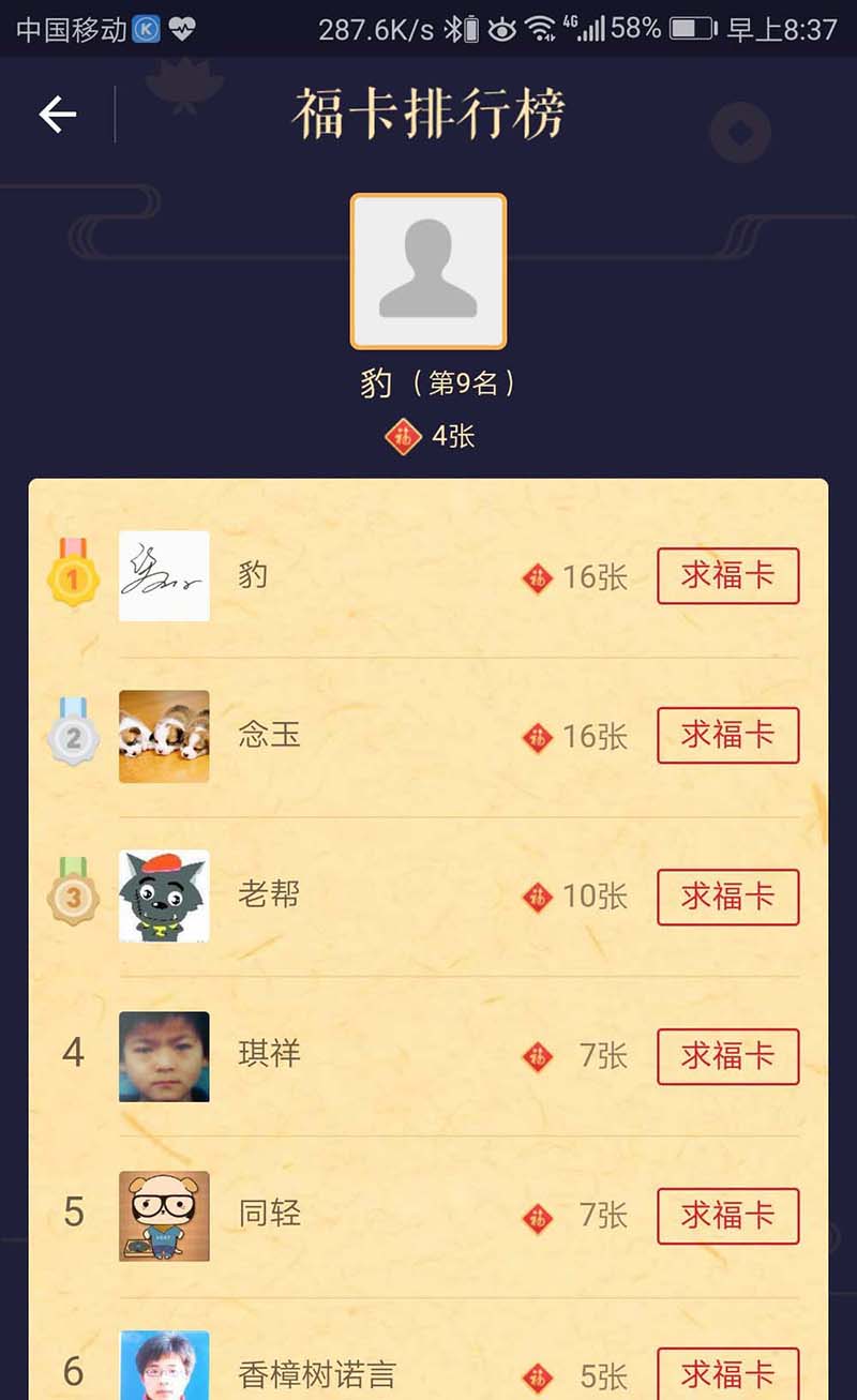 6、在排行榜可以直接向好友索要福卡也可以查看好友排行