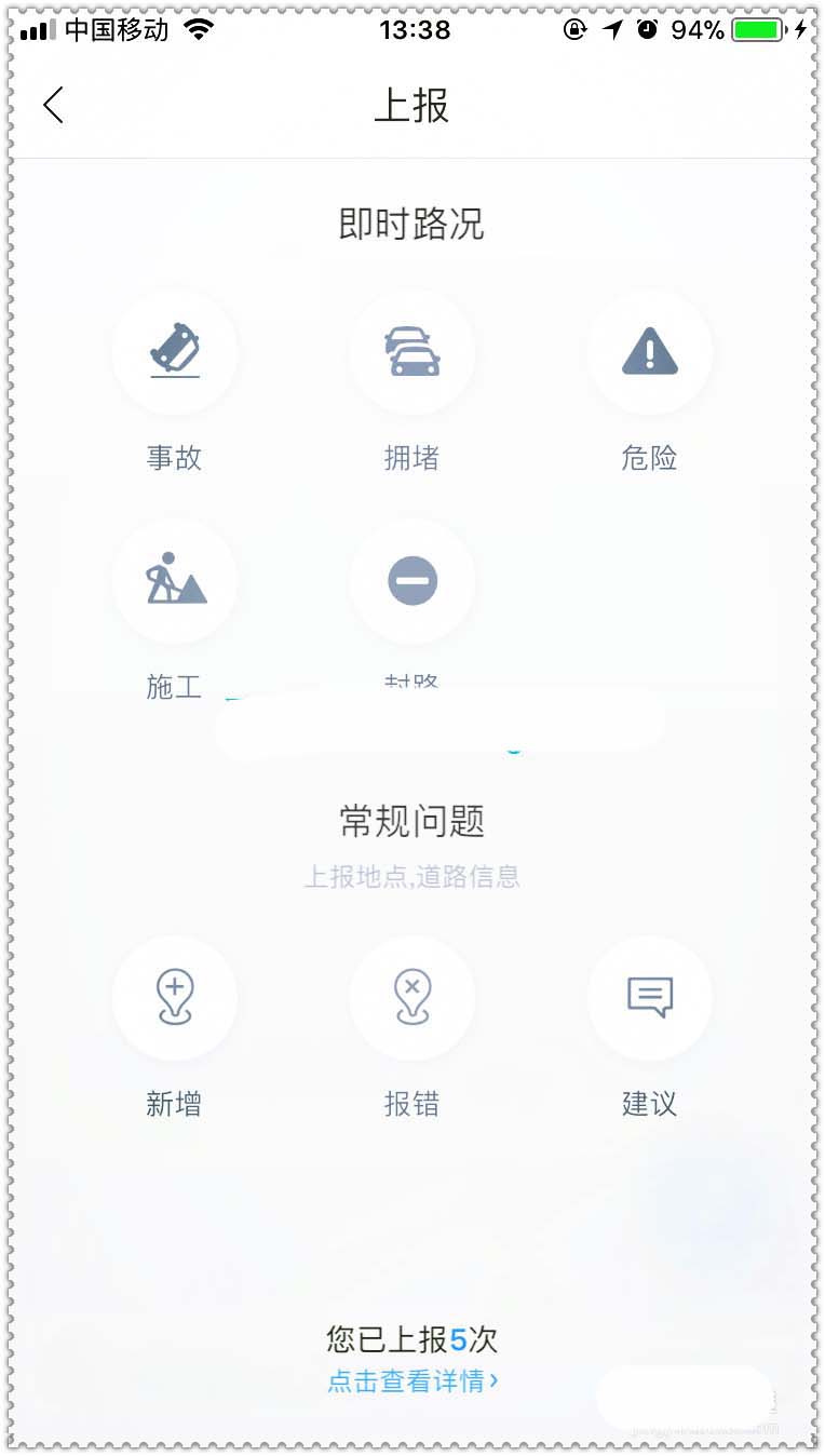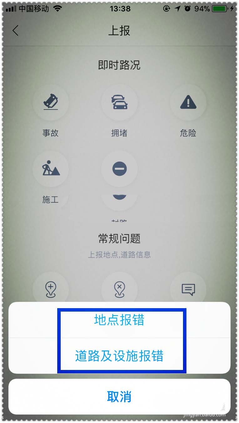 2、点击“上报”按键后在屏幕下端弹出一个小操作栏,可以看到有两大类,即时路况和常规问题,即时路况有事故、拥堵、危险、施工、封路等几类,对应情况选择就好,还有一类就是常规问题,含新增、报错和建议。