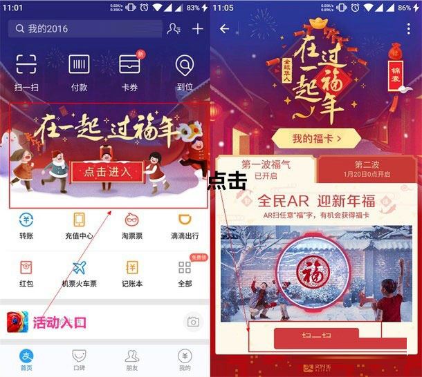 一、首先打开支付宝最新版,首屏出现“在一起 过福年”活动页面,点击进入--去迎福气。
