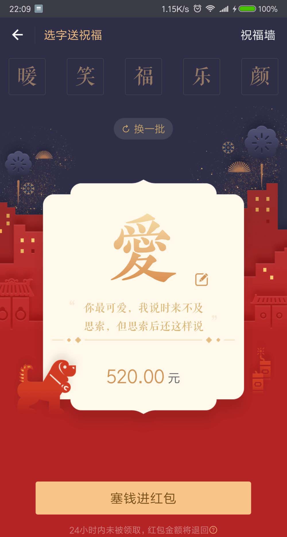 7、输入爱字,在繁体输入法下,会输成"愛",下面的红包自动变520。这样的红包不但更有分量,而且显示出你的用心,首先要发现这个方法,还要会设置繁体才能发出520的红包。