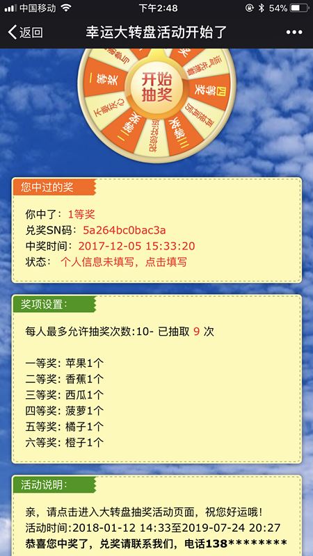第五步:回到公众号,向公众号发送关键词即可弹出我们刚做的活动,也可以将此活动的链接添加到阅读原文或自定义菜单中,后台可以看到全部参与的粉丝信息,点击SN码管理,里面是获奖粉丝的信息,下面是案例赏析