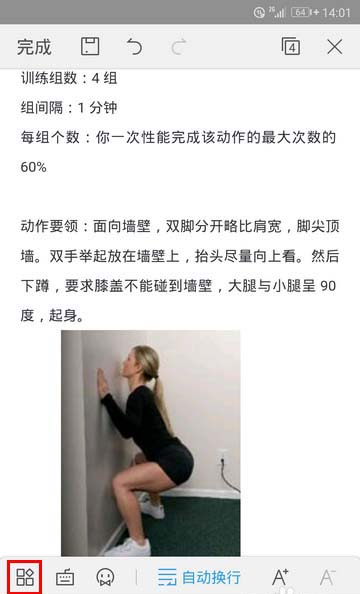 3、点击之后,文档将进入编辑状态。在编辑状态中,点击底部工具栏上的首个方格图标。