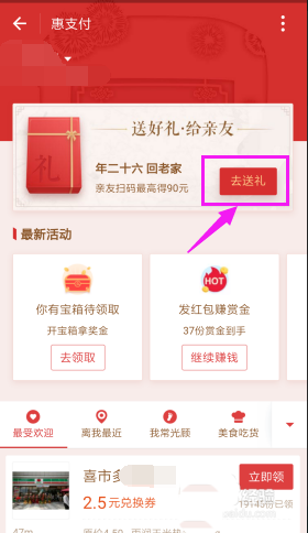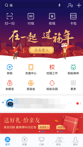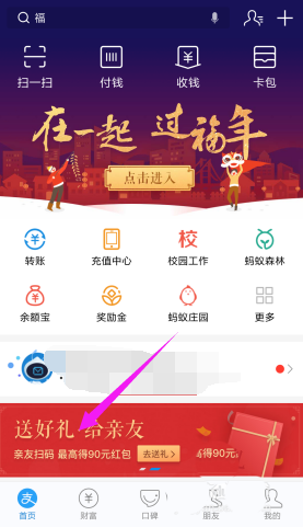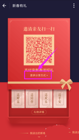 支付宝中可以给好友送礼,我们可以把新春送礼的二维码给我们的好友进行扫一扫,他们扫后可以获得一些优惠券等东西,我们自己也能获得红包现金,一般是0.66,下面我们就来看看详细的教程。