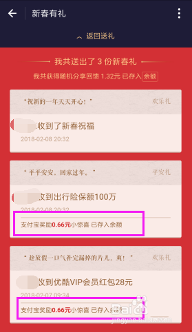 6、好友扫码后,我们就可以获得新春回礼的红包。一般金额都是0.66 。