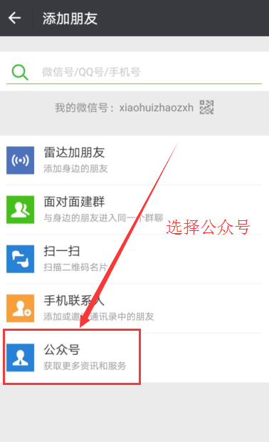 2、进到添加朋友界面,选择公众号进去