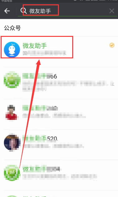 3、在搜索框中输入微友助手,如下图所示,点击第一个微友助手进去即可