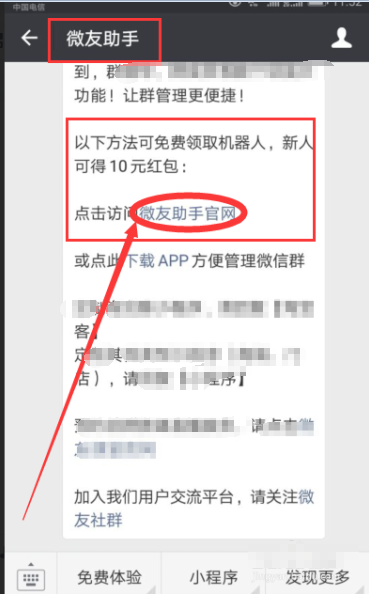 5、进入到微友助手公众号界面,如下图所示,点击进入官网看看