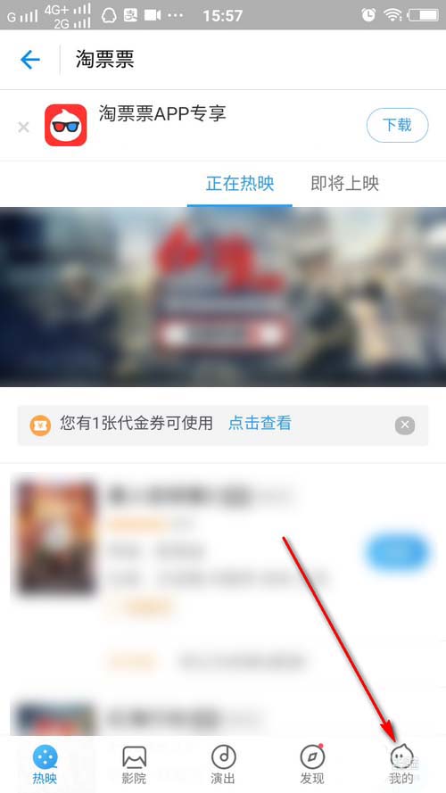 2、点击【电影票】后,会弹出电影购买选择,点击右下角的【我的】。