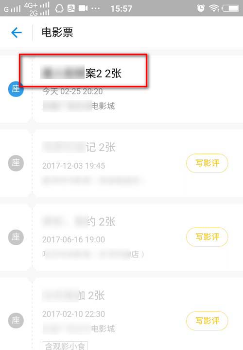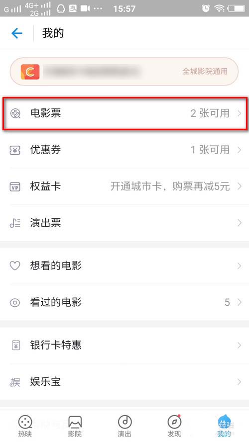 3、界面弹出自己已经购买的电影票张数了,点击张数前的【电影票】。进入电影票界面,页面会弹出订购电影的名称,点击电影的名称。