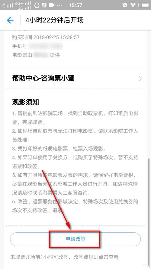 4、页面弹出电影取票二维码及开场时间,把页面拉到最下,点击【申请改签】。